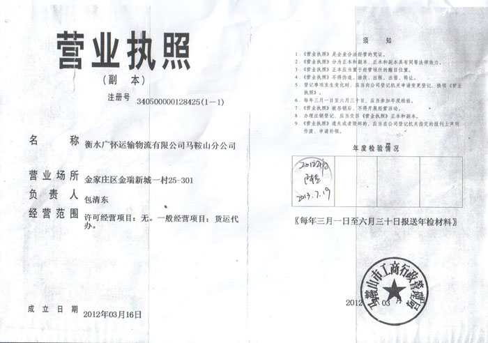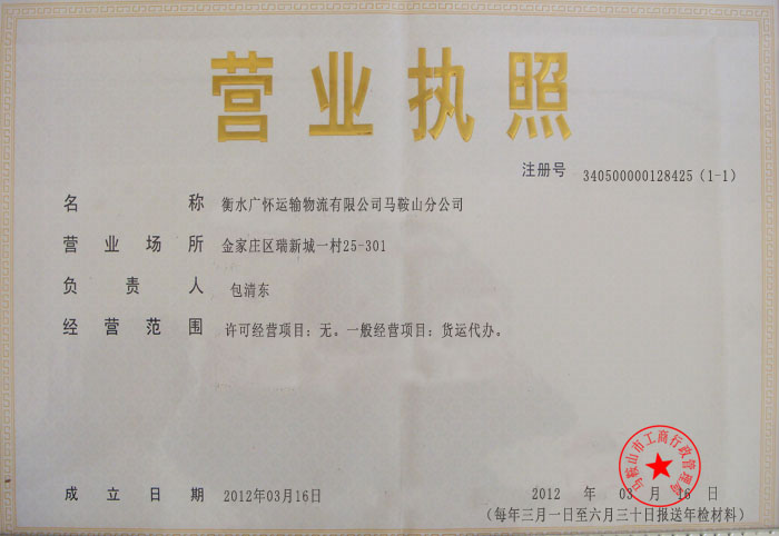 衡水广怀运输物流有限公司马鞍山分公司营业执照(副本)