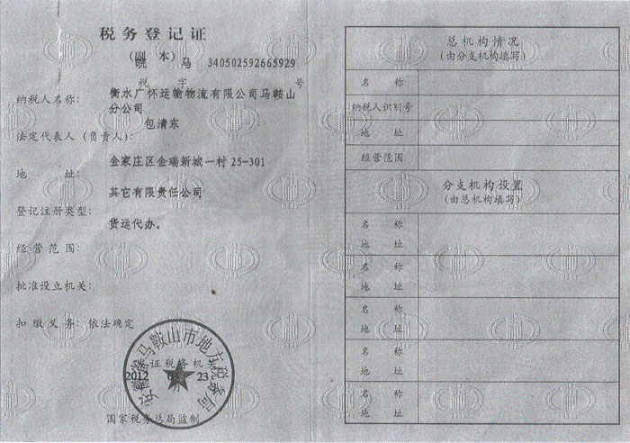 衡水广怀运输物流有限公司马鞍山分公司税务登记证