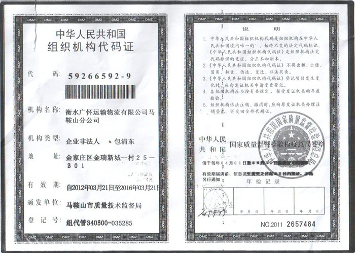 衡水广怀运输物流有限公司马鞍山分公司组织机构代码证